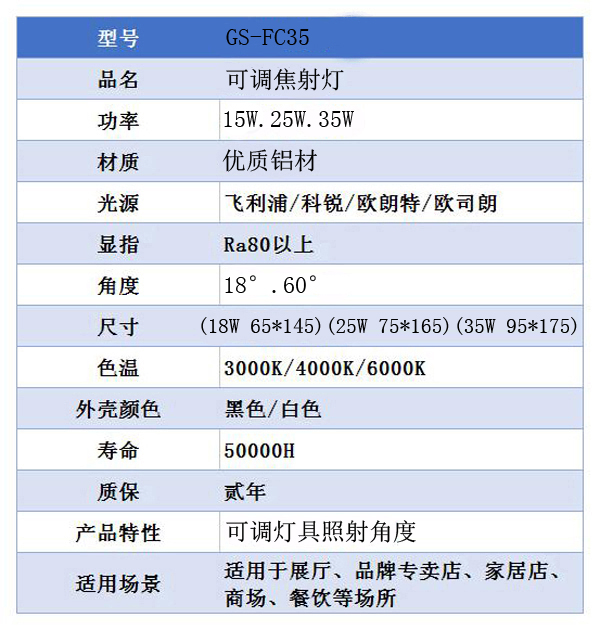 3、可調(diào)焦射燈GS-FC35搭載原裝進(jìn)口光源、驅(qū)動(dòng)。LED燈具顯色性強(qiáng),逼真程度高;