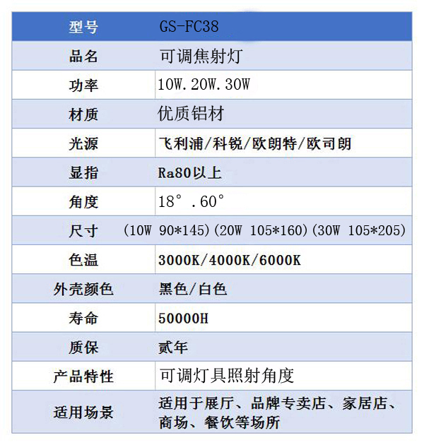 3、可調(diào)焦射燈GS-FC38搭載原裝進(jìn)口光源、驅(qū)動(dòng)。LED燈具顯色性強(qiáng),逼真程度高;