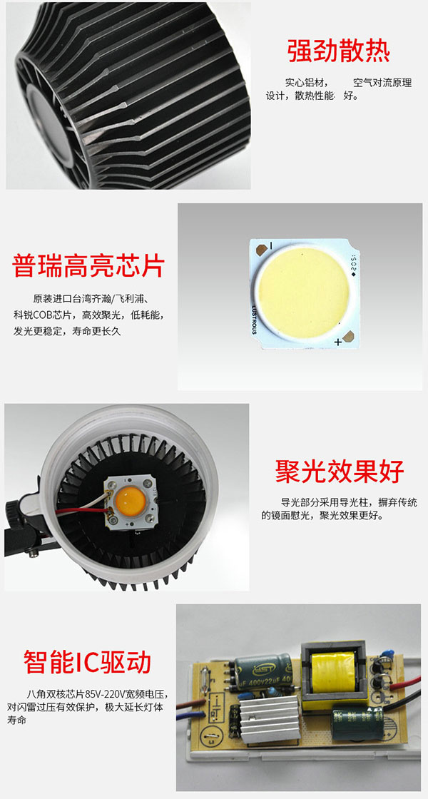 3、LED射燈高品質(zhì)光照,環(huán)保,節(jié)能,經(jīng)濟(jì)效益特佳,超長(zhǎng)壽命,50000小時(shí),耐用更省心。4、LEDCOB軌道燈適用于展廳、商店照明、汽車陣列室、品牌專賣店、等一切場(chǎng)所。