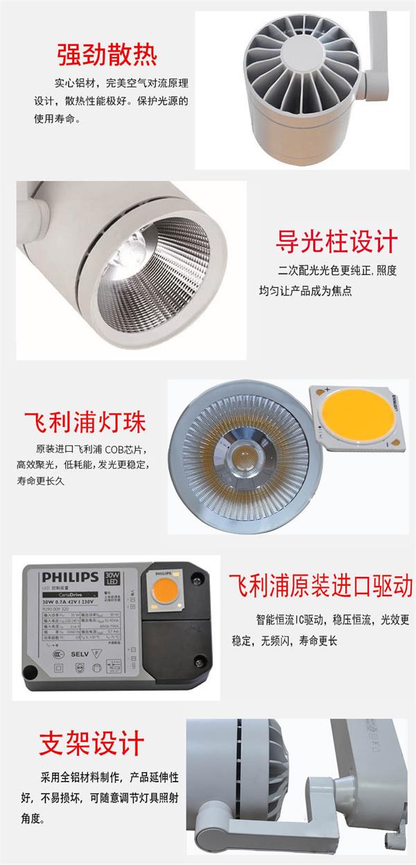 3、40wcob導(dǎo)軌射燈GS-SP229采用COB技術(shù)封裝的LED光源,散熱效果佳,光色柔和純正;